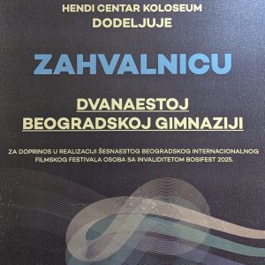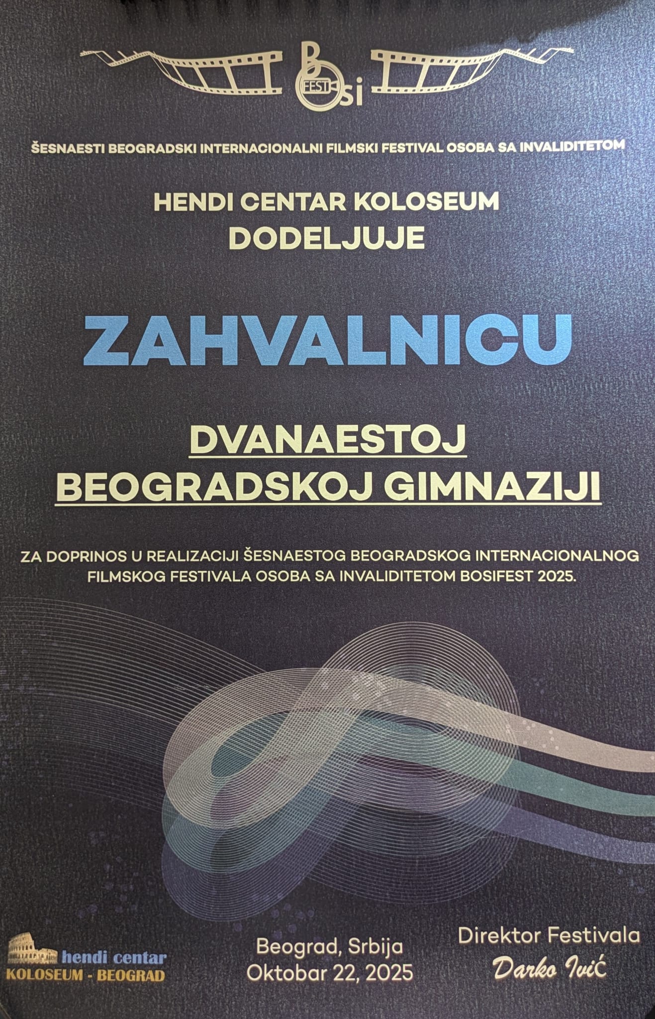 Дванаеста београдска гимназија и новинарска секција наше школе је, у организацији наставнице Оље Суботић у сарадњи са директором фестивала Дарком Ивићем, тимом за инклузију и колегом Дарком Илићем, ове године учествовала на шеснаестом београдском интернационалном филмском фестивалу особа са инвалидитетом – Босифесту под називом Океан могућности